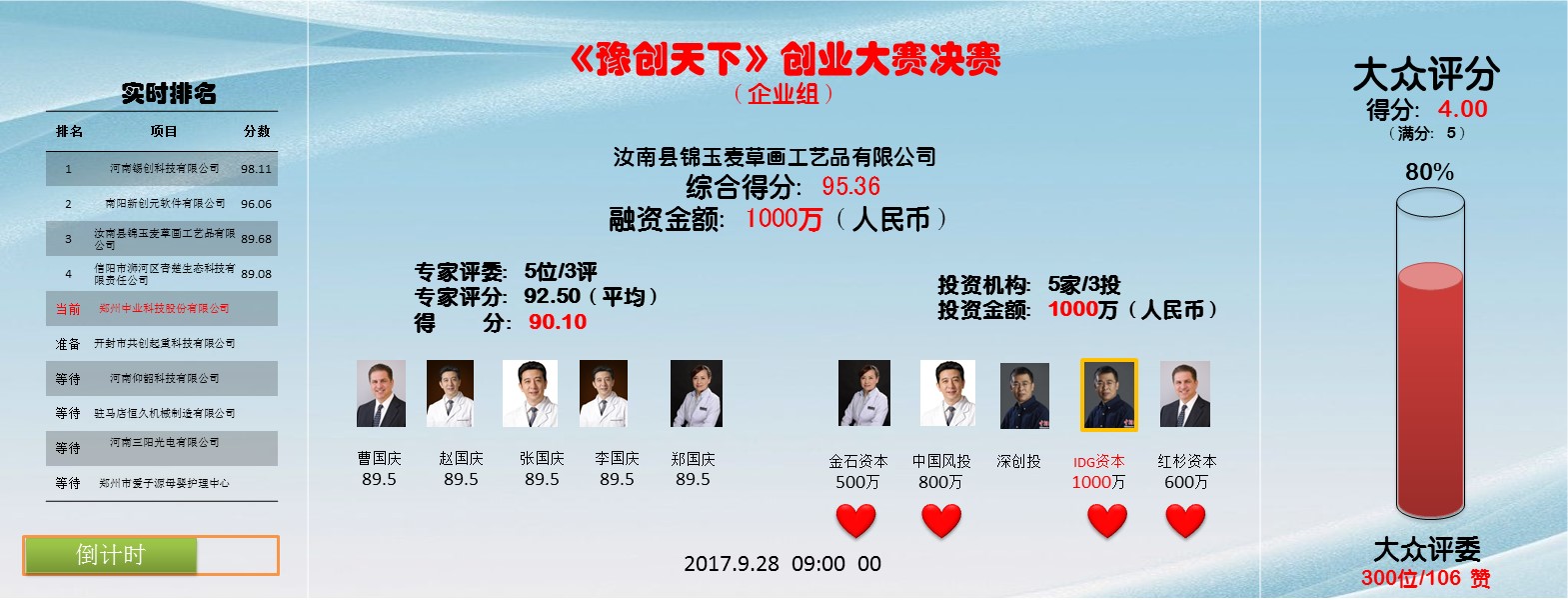 河南省《豫创天下》创业大赛的实时评分系统,用的是【纬地云】的“评分系统”系统,实现了:当场打分,当场出结果,动态排名,透明显示,“大众评委”支持支持率动态变化,点赞人数实时攀升,投资人心动意向表示,投资额当场输入,实时显示,融资意向选择当场锁定,以上内容全部在整合同一界面展示,效率高,公开、公正、透明,不给“人为插手”任何机会,彻底消除疑问和顾虑,做到比赛无争议;大众参与度高,整场跌宕起伏,扣人心弦,环节紧凑,有序可控,确保比赛在网络科技的氛围中完美收官。